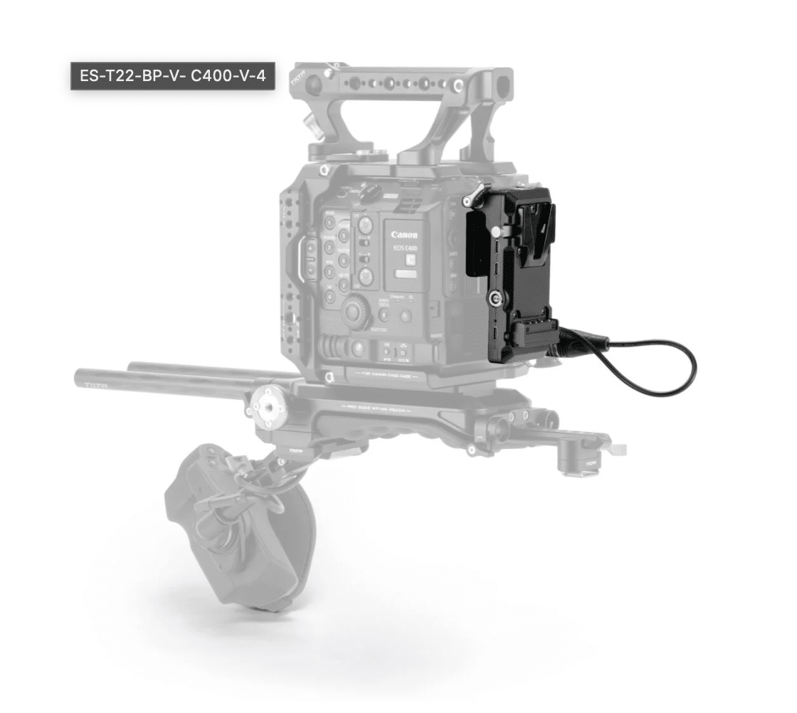 This V-Mount Battery Plate mounts directly to our Camera Cage for Canon C400 and features the following outputs: PD USB-C, P-Tap, and 2 Pin as well as a PD USB-C input.